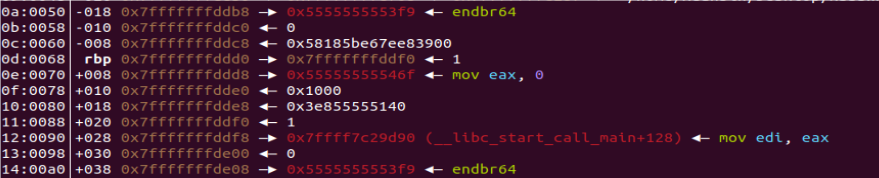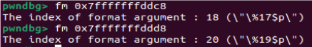 gdb调试确定0x7fffffffddc8和0x7fffffffddd8是要泄露的两个地址,用fmtarg获取两处地址的偏移